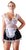Overdelen er komplett i hvit blonde. De tynne stroppene er justerbare, og blondetoppen kan også brukes skulderfri. Det ugjennomsiktige, svarte skjørtet er lett utsvingt, og nede vises en hvit blondekant... Et lite hvitt serveringsforkle til å knyte og kantet med blonde avrunder antrekket.