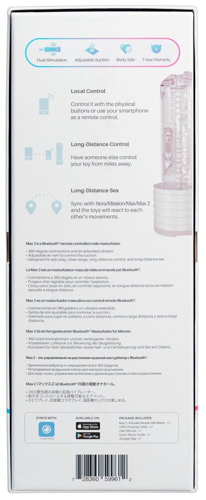 7 Vibrationsmodi und 3 Kontraktionseinstellungen sind per Knopfdruck direkt am Toy steuerbar. Noch bequemer geht’s mit der Lovense-App auf dem Smartphone mit vielen zusätzlichen Funktionen. Ganz komfortabel via Bluetooth. Hier kann man Stimulations-Programme selber kreieren und bequem über das Smartphone steuern und speichern. Auch vom Partner oder der Partnerin über große Entfernung. Für gefühlsechten Sex auf Distanz kann der Max 2 mit kompatiblen Partner-Toys gekoppelt werden. Teledildonic-Sensoren übertragen dann die Bewegungen des Partners oder der Partnerin auf den Masturbator – und umgekehrt. Außerdem kann sich der Masturbator mit interaktiven Videos, virtueller Realität, Games und Musik synchronisieren.