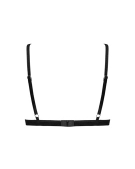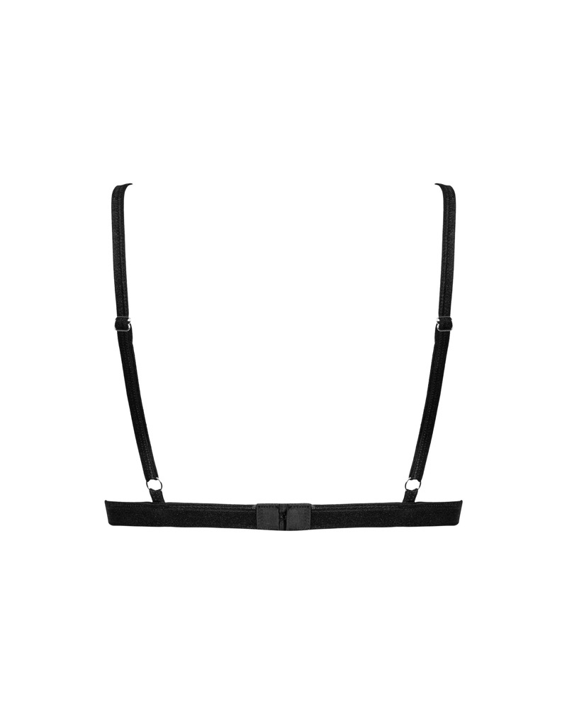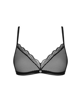 Soutien-gorge souple noir Mibelia d'Obsessive en résille stretch douce avec décoration en dentelle et petit élément décoratif entre les bonnets souples. Fermeture à crochets réglable dans le dos. Les bretelles sont également réglables.