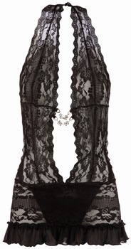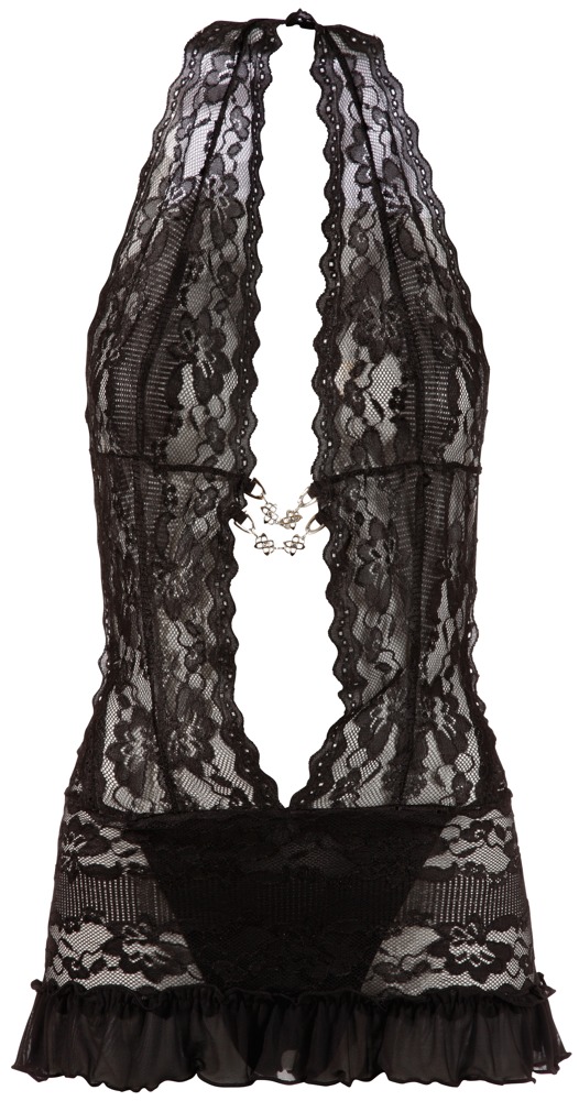 Delicate dress made out of floral lace. With a halterneck and very low-cut neckline that is only held together by 2 decorative chains. The dress is completely backless. Includes a sewn-on crotchless string. Lace subject to change.