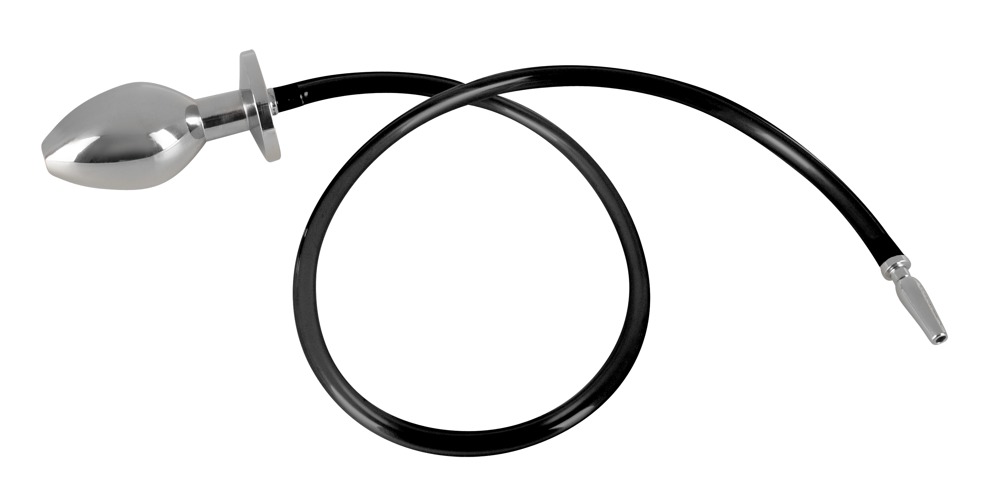 Der hohle, schwere Analplug ist über den Schlauch mit dem offenen Penisplug verbunden. Analplug: Gesamtlänge 7,8 cm, Ø max. 3,7 cm, 374 g schwer; Penisplug: 3,3 cm, Ø max. 0,9 cm; Schlauchlänge 62 cm. Inklusive Ersatzschlauch in Schwarz.