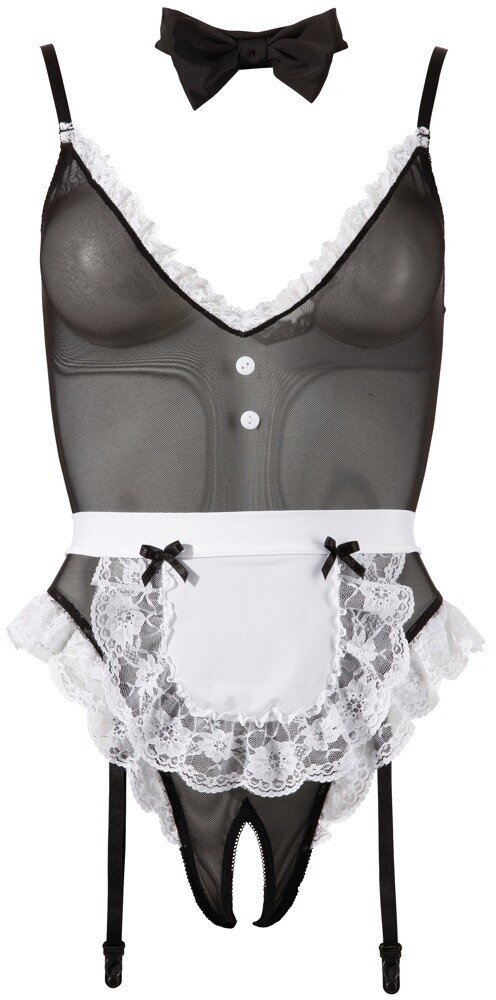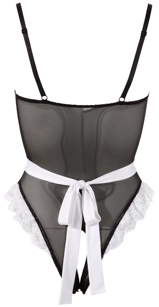 Body i powernet med blondepynt, justerbare stropper samt juster- og avtagbare strømpestropper. Åpen i skrittet. Inklusive halsbånd med sløyfe og borrelås. Forkle til å knyte. Svart/hvitt. 90% polyamid, 10% elastan. Halsbånd og forkle i 95% polyester, 5% elastan.