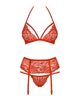 Biustonosz, pas do pończoch i stringi w komplecie 838-SEG-3 od Obsessive. Wszystkie trzy elementy bielizny wykonane z miękkiej, elastycznej czerwonej koronki. Biustonosz na szyję z ramiączkami i biżuteryjnym detalem między miękkimi miseczkami. Ramiączka halterneck i paski do pończoch są regulowane dla idealnego dopasowania.