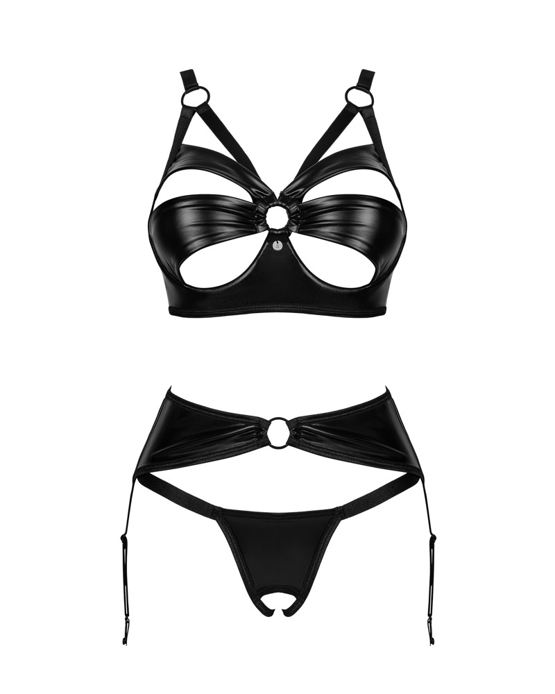 conjunto de 3 piezas Armares by Obsessive con sujetador con aros, liguero y tanga sin entrepierna. Totalmente en un moderno efecto mojado, elástico y suave al tacto. Copas con seductores recortes y pequeños elementos de bisutería. Los tirantes están ingeniosamente adornados con anillas y pueden ajustarse a la medida, al igual que el cierre de gancho de la parte posterior. El liguero tiene una anilla delante y un gancho ajustable detrás. Los tirantes también son ajustables. El tanga de efecto mojado está seductoramente abierto en la entrepierna