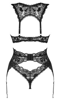 3-piece lingerie set Donna Dream by Obsessive consisting of underwired bra, suspender belt and thong. All parts made of beautiful black lace that is elastic and soft against the skin. The straps are also adjustable to fit. Suspender with clip suspenders on each side and adjustable hook fastening at the back.