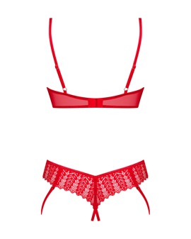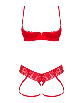 Åpen bøyle-BH og strengtruse i rødt sett Ingridia fra Obsessive. I myk og elastisk stretchstoff og blonde. Vatterte bøyleskåler støtter bysten. Hektelukking bak. Justerbare skulderstropper. Strengtruse i blonde med åpent skritt og fast påsydde stropper som betoner bena.