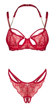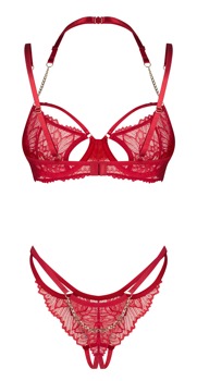 The Matildea set from Obsessive is made up of an underwired bra and crotchless thong. It is in a seductive style – it is made out of deep red material with delicate lace and decorative gold-coloured details. It is soft and stretchy for a very comfortable fit. The underwired bra has chains on the adjustable bra straps and on the decorative, adjustable and removable halterneck. The cup straps can also be adjusted to fit. The crotchless thong has a seductive little chain over the buttocks and a small decorative detail at the front.