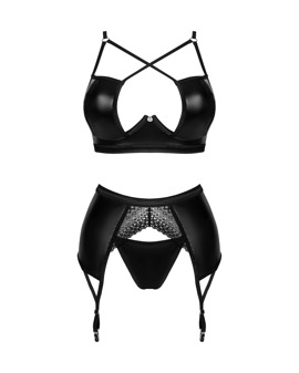 3-piece set Norides by Obsessive with an underwired bra, suspender belt and thong in a wet look that feels stretchy and soft. Underwired bra in a sophisticated style with straps and an extravagant neckline. The straps can be adjusted to fit - as can the hook fastener at the back. The suspender belt has a lace insert at the front and a hook fastener at the back. The suspender straps are adjustable to fit. The wet look thong seduces with a small lace triangle on the bum.