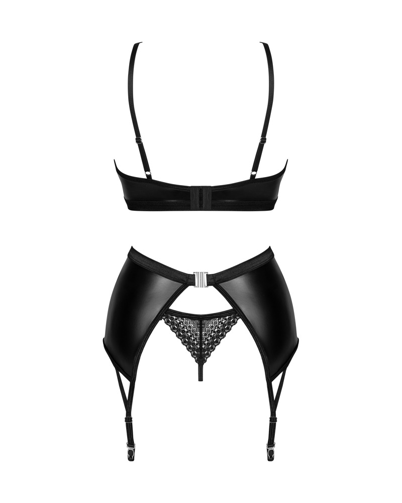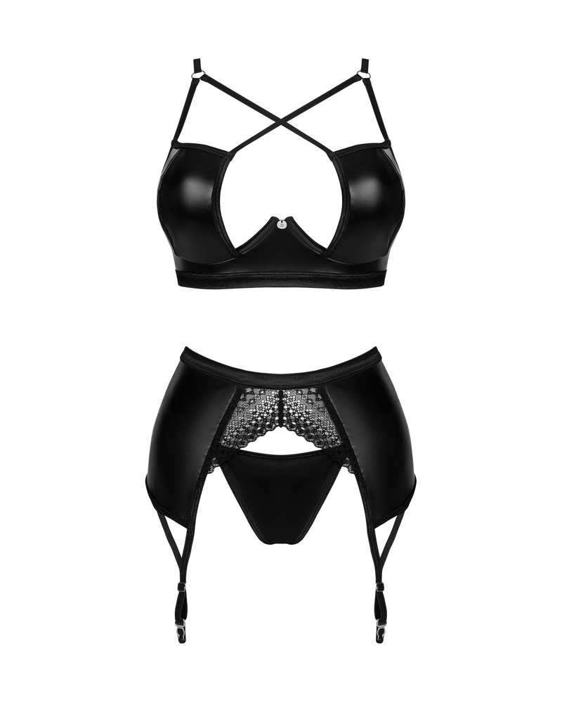 3-delers sett Norides fra Obsessive med bøyle-BH, hofteholder og strengtruse i wetlook. Det myke, elastiske stoffet legger seg hudnært inntil kroppen og føles maksimalt behagelig. Bøyle-BH med pyntestropper og sexy utringing. Justerbare skulderstropper. Hektelukking bak. Hofteholder med innsats av blonder foran og hektelukking bak. Matchende strengtruse.