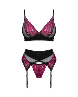 elegante set reggicalze 3 pezzi Rosenty di Obsessive con reggiseno con ferretto, reggicalze e perizoma. Morbida rete nera e fine pizzo rosa in un elegante mix con materiale elasticizzato nero opaco. Reggiseno con elemento decorativo tra le coppe con ferretto e chiusura a gancetto regolabile sulla schiena. Anche le spalline possono essere regolate per adattarsi. Così come le bretelle e la chiusura a gancio del reggicalze.