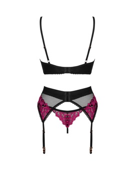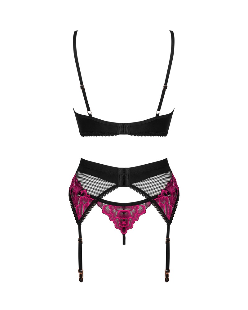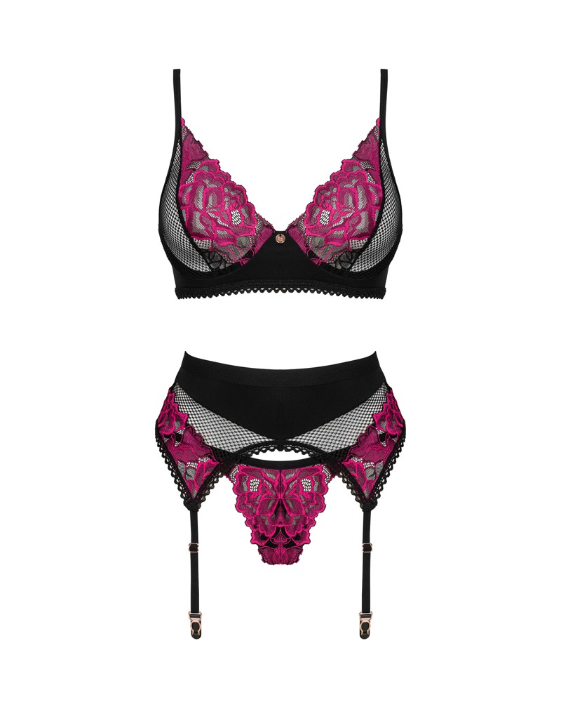 elegante conjunto de ligueros de 3 piezas Rosenty de Obsessive con sujetador con aros, liguero y tanga. Suave malla negra y fino encaje rosa rosado en una elegante mezcla con material elástico negro opaco. Sujetador con un elemento decorativo entre las copas con aros y cierre de gancho ajustable en la espalda. Los tirantes también pueden ajustarse a medida. Al igual que los tirantes y el cierre de gancho del liguero.