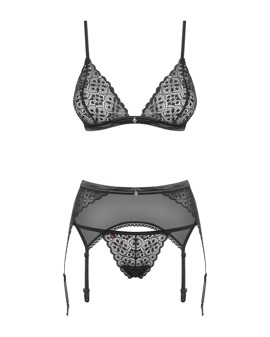 set 3 pezzi Shibu by Obsessive con reggiseno morbido, reggicalze e perizoma. Tutti in trasparenza nera con dettagli in pizzo. Morbido ed elasticizzato su tutto il corpo per un elevato comfort. Reggiseno con chiusura a gancetto regolabile sulla schiena. Anche le spalline e il reggicalze possono essere regolati per adattarsi.