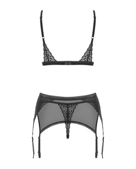 ensemble 3 pièces Shibu de Obsessive avec soutien-gorge souple, porte-jarretelles et string. Le tout dans une fine transparence noire avec des détails en dentelle. Entièrement doux et élastique pour un grand confort. Soutien-gorge avec fermeture à crochet réglable dans le dos. Les bretelles et les jarretelles sont également réglables.