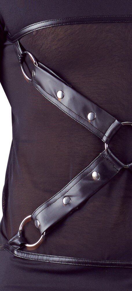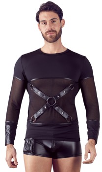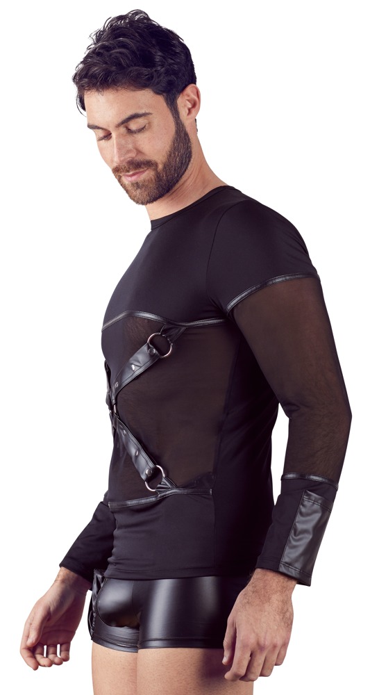 Matte look shirt with long sleeves and a stylish powernet insert at the front to show off a man's muscles. The removable chest harness (press studs) has beautiful and exclusive details for the onlooker and it is also seductive, inviting and will whet a partner's appetite.