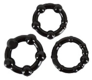 Tre svarta penisringar som ger en långvarig erektion. Ø inuti: 5 cm, 4,2 cm och 3,2 cm. Material: silikon.