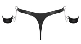 The black thong from Svenjoyment Bondage includes soft handcuffs. It is made out of matte look with silver-coloured metal accessories. It is soft and stretchy for a very comfortable fit. There are decorative studs at the front of the thong. There are rings at the front and sides of the waistband. The included handcuffs with snap hooks can be easily attached to the rings. The soft matte look handcuffs can be put on and adjusted quickly, thanks to their hook and loop fasteners.