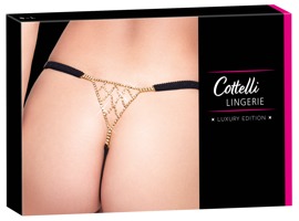 Lussuoso perizoma nero di Cottelli LINGERIE con parte anteriore in morbido materiale elasticizzato e accessori color oro. Il triangolo di stringhe sul retro è elaborato con strass scintillanti. I laccetti elastici in vita possono essere regolati lateralmente.