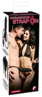Strap-on i kunstlær inklusive tre ringer med ulik diameter: 4, 4,5 og 5 cm. Lilla/svart. Maksimalt omfang: hofte 134 cm, bein 82 cm. Materiale: Kloroprenkautsjuk (bånd), polyester (seletøy), nitrilkautsjuk (ringer), kobber/sinkplattert metall (nagler).