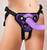 Kunstlederen strap-on harnas inclusief drie ringen met verschillende diameters van 4 cm, 4,5 cm en 5 cm. Paars/zwart. Maximale omtrek: heupen 134 cm, benen 82 cm.