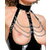 Set in vinile nero Level con top e perizoma overt. In nero lucido con accessori e catene color argento. Top corto, senza seno e senza schienale, con coppe con ferretto. Chiusure laterali con fibbie regolabili. Cinghia sternale regolabile sul davanti sull'anello del colletto. 3 catene su ciascun seno esposto. Chiusura a gancio regolabile sulla schiena e sul colletto. Giostring in vinile abbinato, anch'esso con catena e anelli sul davanti. Le cinghie elastiche ai lati assicurano una vestibilità comoda e sicura.
