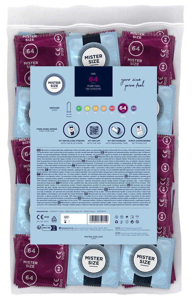 A man/woman can pick the right condom size for the penis by using the front of the packaging because there is a wide, dark blue measuring scale in the middle. Size 64 is suitable for a penis circumference of 14.5 to 15.5 cm.