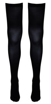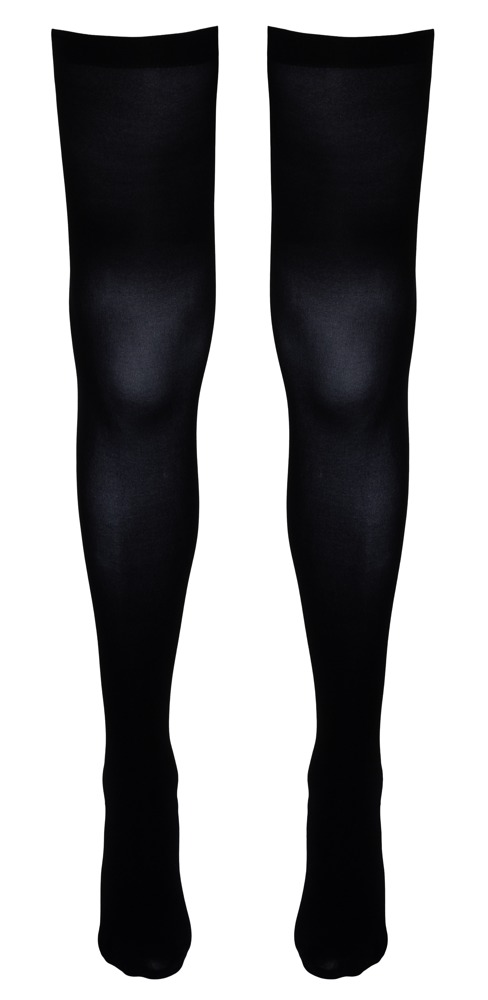 Ugjennomsiktige, svarte overknees med nettingsøm bak. Gummibånd i kanten forhindrer at de sklir.