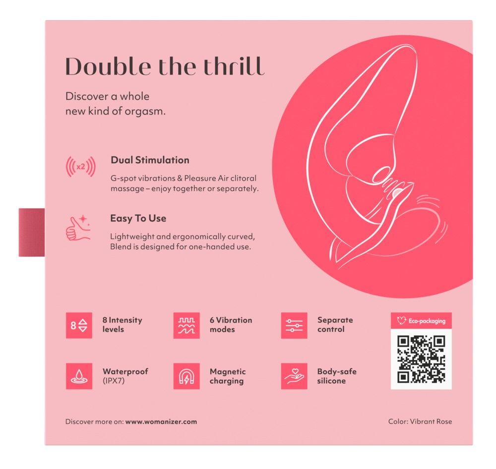 Den elegante BLEND fra Womanizer kombinerer den revolutionerende Pleasure Air-teknologi med intens G-punktsstimulering i ét stykke legetøj. Den kommer i et meget praktisk format og er supernem at bruge! Pulsatoren forkæler blidt klitoris på ydersiden, mens G-zonen i skeden samtidig forkæles af kraftige vibrationer. Dette gør sensationelle blandede orgasmer mulige!