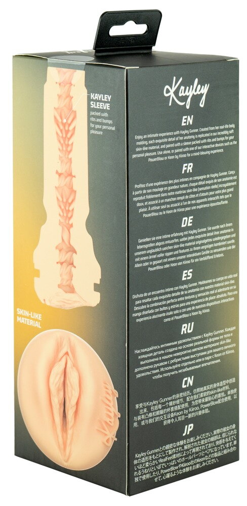 Feel Kayley Gunner masturbator fra Kiiroo med originalstøbt vulva af den erotiske stjerne Kayley Gunner. Det meget forskelligt strukturerede indre kommer også meget tæt på Kayleys vagina og giver en intens massage under et handjob. Det indre sleeve af hudlignende blødt materiale er endda signeret med Kayleys autograf ved siden af vulvalæberne. Sleevet kan nemt fjernes fra det skridsikre, diskrete hus for at blive rengjort.