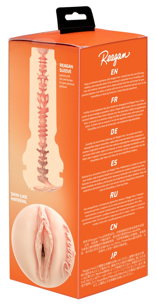 Feel Reagan Foxx masturbator fra Kiiroo med originalstøbt vulva af den erotiske stjerne Reagan Foxx. Det meget forskelligt strukturerede indre kommer også meget tæt på Reagans vagina og giver en intens massage under et handjob. Det indre sleeve af hudlignende blødt materiale er endda signeret med Reagans autograf ved siden af vulvalæberne. Sleevet kan nemt fjernes fra det skridsikre, diskrete hus for at blive rengjort.