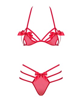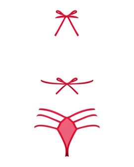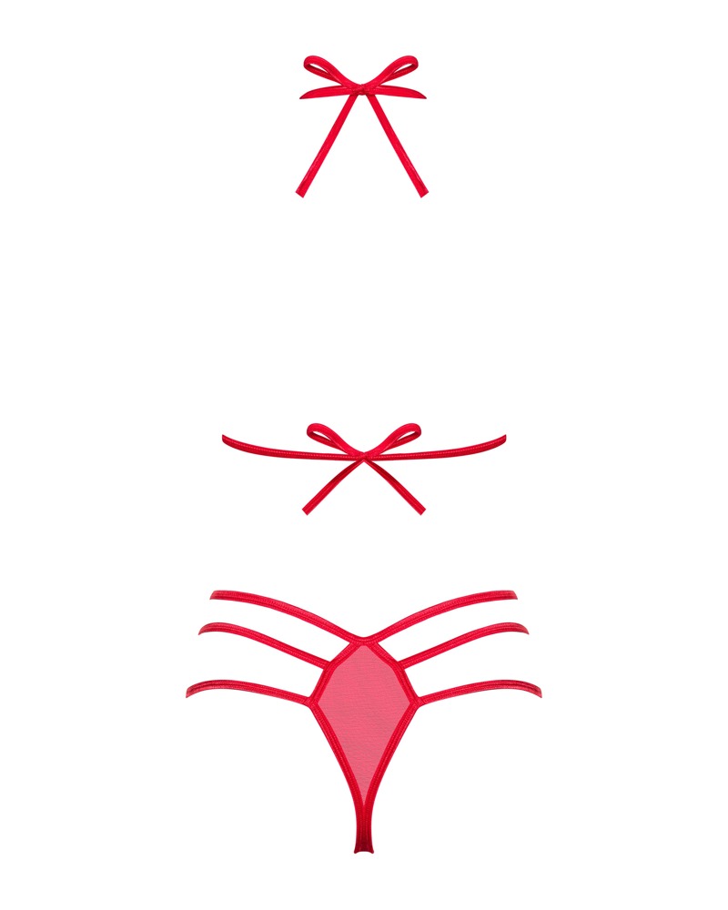 Rotes Set Giftella von Obsessive mit Soft-BH und String. Weiches semi-transparentes Stretchmaterial in stylischer Riemenoptik und mit dekorativen Zierschleifen. BH mit Neckholder zum Binden sowie Bindeschleife im Rücken.