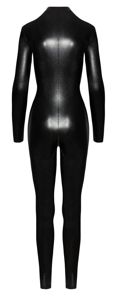 Skin-tight jumpsuit Boudoir Stories Exclusive from Noir with long sleeves from Noir. It is fitted at the waist, is made out of shimmering, shiny matte material and has a snakeskin pattern on it. It also fits like a second skin. The jumpsuit is soft and stretchy which means that it is very comfortable to wear. The 3-way metal zip is convenient and erotic at the same time because it starts at the small stand-up collar, goes over the crotch and stops at the top of the buttocks. It can be opened in various ways.