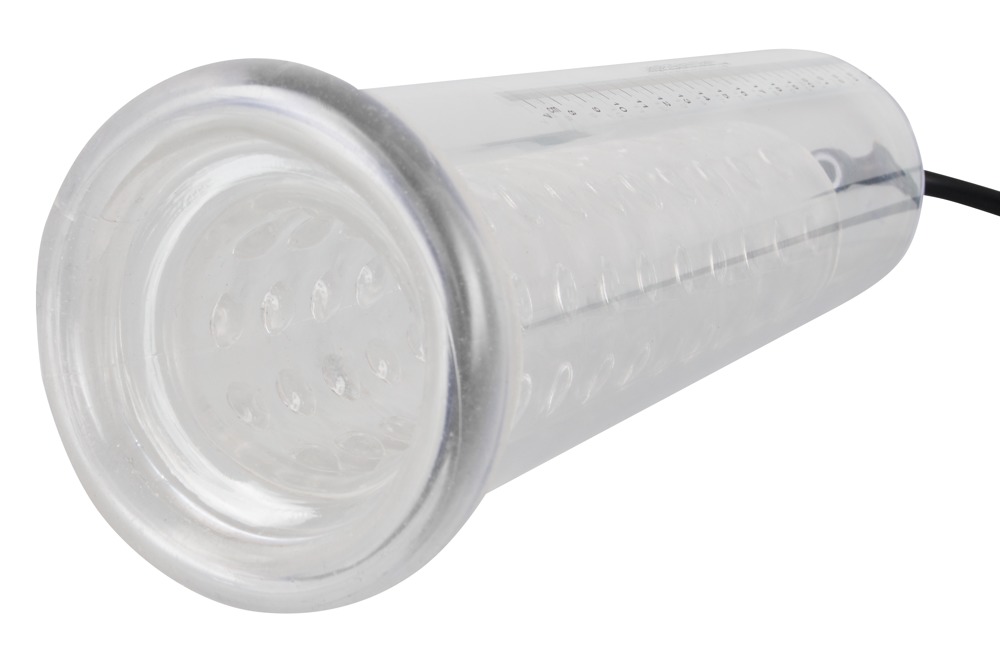 El pene lubricado se introduce en el cilindro transparente y se cierra firmemente en la raíz por la manga de silicona suave. La práctica bomba con válvula de liberación integrada crea un vacío y el cilindro transparente con la escala de medición muestra el tamaño respectivo del pene. Además el pene es estimulado con una funda de silicona transparente con nudos.