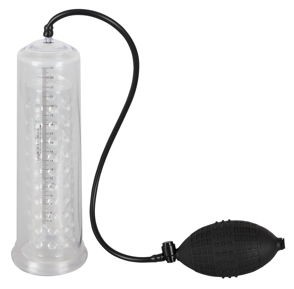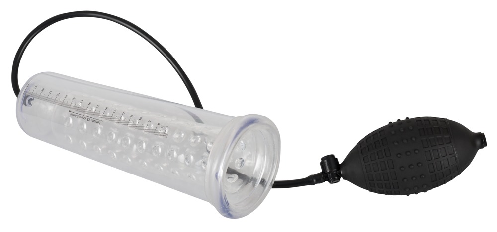 Transparent penispumpe med nopret indvendig manchet (Ø 4,5 cm, elastisk, længde ca. 20 cm) og en praktisk pumpebold. Du kan aflæse din succes med forstørrelsen på måleskalaen. Med sikkerhedstrykventil.