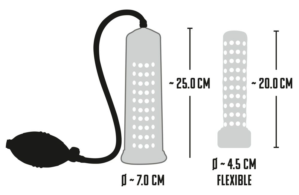 Gjennomsiktig penispumpe med nuppete mansjett inni (diameter 4,5 cm, tøyelig, lengde ca. 20 cm) og hendig pumpeball. På måleskalaen kan du lese av framgangen. Med sikkerhets-trykkventil. Sylinderen er ca. 25 cm lang. Materiale: ABS, TPE (mansjett), PVC (pumpeball).
