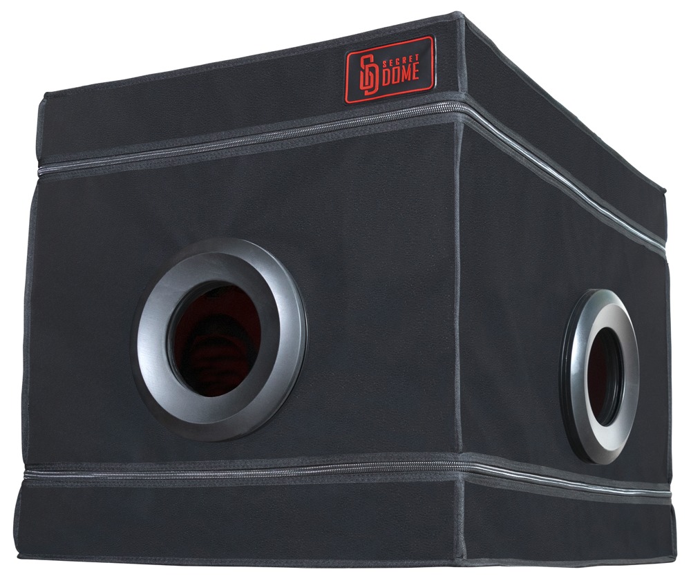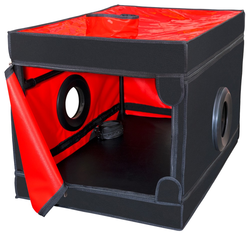 Cabine BDSM fermée La Niche de Secret Dome pour les jeux GloryHole, les Dark Games, les jeux de rôle captivants et autres fantaisies. La cabine stable est rapidement montée et prête à l'emploi grâce à son système d'emboîtement de tubes et à sa toile robuste. Avec 3 grandes ouvertures sur les côtés. L'ouverture pour la tête est équipée d'une fermeture éclair et d'une large collerette réglable. Accès confortable par une porte à fermeture éclair. Une lumière LED et un tapis de sol doux assurent un meilleur confort. Les menottes et les entraves fournies (1 paire chacune) peuvent être placées à l'intérieur selon les besoins. Les manchettes souplement rembourrées sont rapidement mises en place et ajustées grâce à des fermetures à boucle.