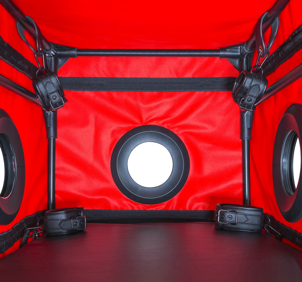 Cabina cerrada BDSM La Niche de Secret Dome para juegos glory hole, juegos oscuros, cautivadores juegos de rol y otras fantasías. La robusta cabina se monta rápidamente y está lista para su uso gracias a su sistema tubular enchufable y su robusta lona. Con 3 grandes aberturas en los laterales. La abertura para la cabeza está equipada con una cremallera y un cuello ancho y ajustable. Cómodo acceso mediante puerta con cremallera. Una luz LED y una alfombrilla blanda garantizan una mayor comodidad. Las esposas y tobilleras incluidas (1 par cada una) pueden colocarse en el interior según sea necesario. Las suaves esposas acolchadas se colocan y ajustan rápidamente mediante hebillas.