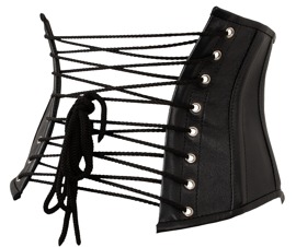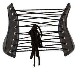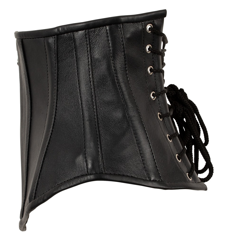 Sort taljekorset lavet af lammelappelæder med lynlås voran og snørring om bag. Behagelig taljeformning ved hjælp af pinde. Velegnet for private møder men også for et besøg i nat- eller swingklub.