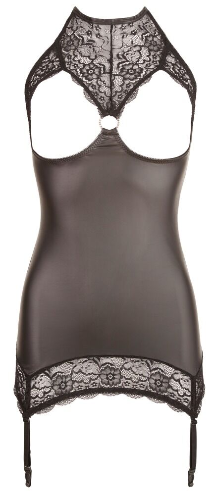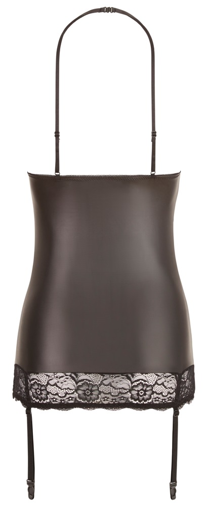 Busteloze lingeriejurk met edele kanten inzetstukken en een sierring van strassteentjes in het decolleté. Opwindend glanzend, aangenaam elastisch en absoluut veilige pasvorm. Riemen en bretels verstelbaar.