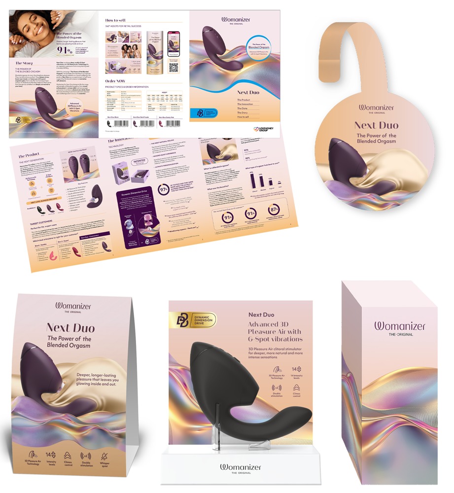 Jetzt auf den neuen Next Duo von Womanizer mit 3D Pleasure Air und G-Spot Vibrations aufmerksam machen! 5-teiliges Merchandise Kit Small mit: