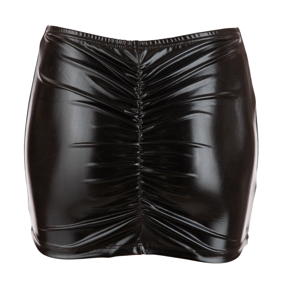 Denna läckra minikjol av svart wetlook presenterar din rumpa på bästa sätt tack vare draperingen. 92% polyester, 8% elastan.