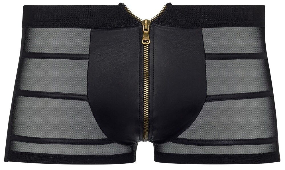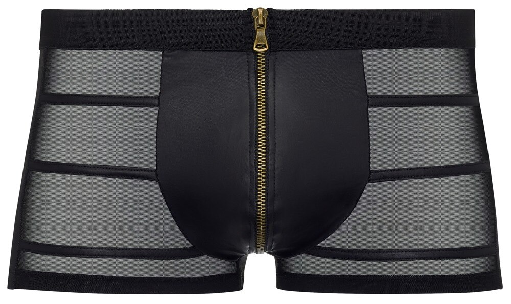 Svart boxer som setter fokus på underlivets sentrum. Og med en rask håndbevegelse blottlegger du det aller viktigste! Boxerens matte look er motemessig helt på høyde og stoffinnsatsene i powernet gir et glimt av deilig hud. Glidelåsen er fôret. Linning.