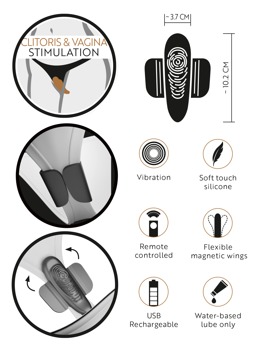 Met zijn magnetische vleugels past de inlegkruisvibrator het beste in slipjes met een smal kruisgedeelte. De houvast is niet gegarandeerd in broeken, shorts, etc.