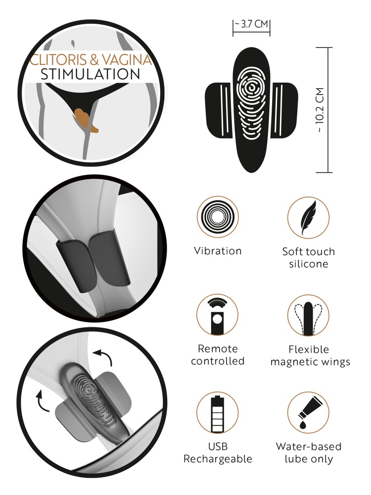 Pantyvibratorn har magnetvingar och passar bäst i en trosa med smal gren. Om den läggs i pants, shorts etc. kan det inte garanteras att den sitter bra.