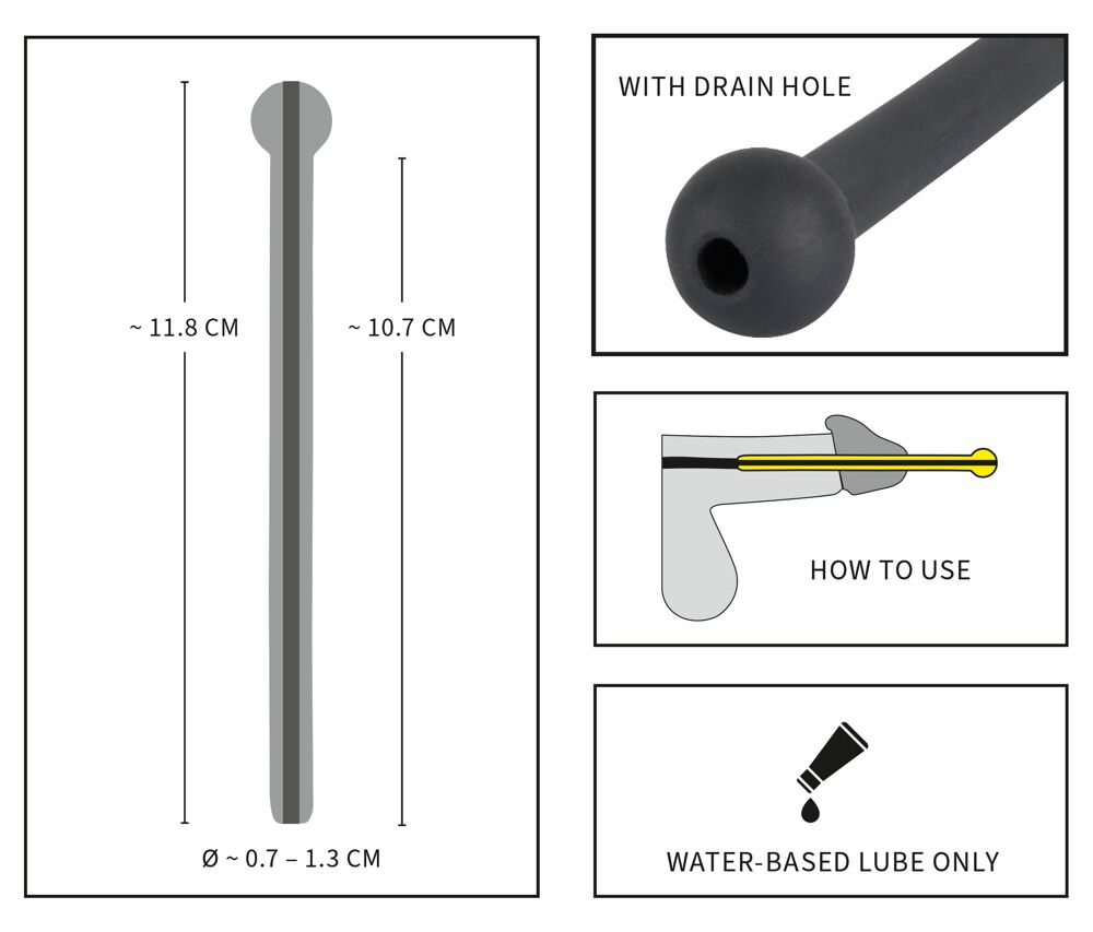 Insert, feel and enjoy – for men who want to experience a new kind of pleasure. The hollow, black dilator gets inserted into the urethra. Flexible. 11.8 cm long, insertion depth 10.7 cm. Ø 0.7 cm. Material: silicone.