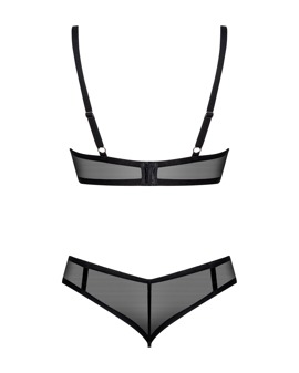 Bøyle-BH og strengtruse i sett Glandez fra Obsessive i edel, svart gjennomsiktighet. Det myke, elastiske stoffet gir maks komfort. BH med rød halterneck av stropper og ring mellom skålene. Justerbare skulderstropper og hektelukking bak. Enkel strengtruse med ugjennomsiktige kanter.