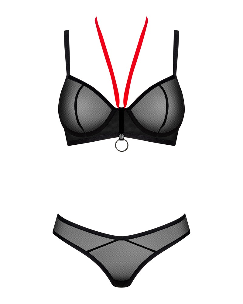 Underwired bra and thong set Glandez by Obsessive in a delicate black see-through design. Soft and stretchy all over for a high level of comfort. Bra with red halterneck for a stylish contrast, ring and small jewellery element between the cups. The straps and hook fastener at the back can be adjusted to fit. The sophisticated cut of the thong with a high waistband seductively emphasises the hips and buttocks.