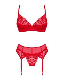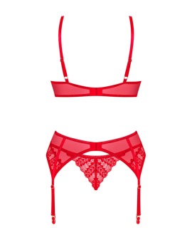 3-piece set Ingridia by Obsessive with an underwired bra, suspender belt and thong. All in red transparent fabric with beautiful lace details. Soft and stretchy all over for high wearing comfort. Padded underwired cups with a small decorative element for a beautiful cleavage. Bra and suspender belt with adjustable hook fastener at the back. The straps and suspender straps can also be adjusted to fit.