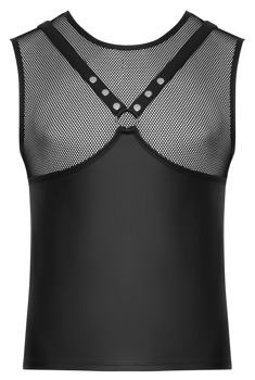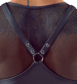 The sleeveless and emphasising shirt from Svenjoyment is in a chest harness style with studs and rings. It is made out of a mixture of stretchy black material that is very comfortable to wear. The materials are stylish matte look and large net.