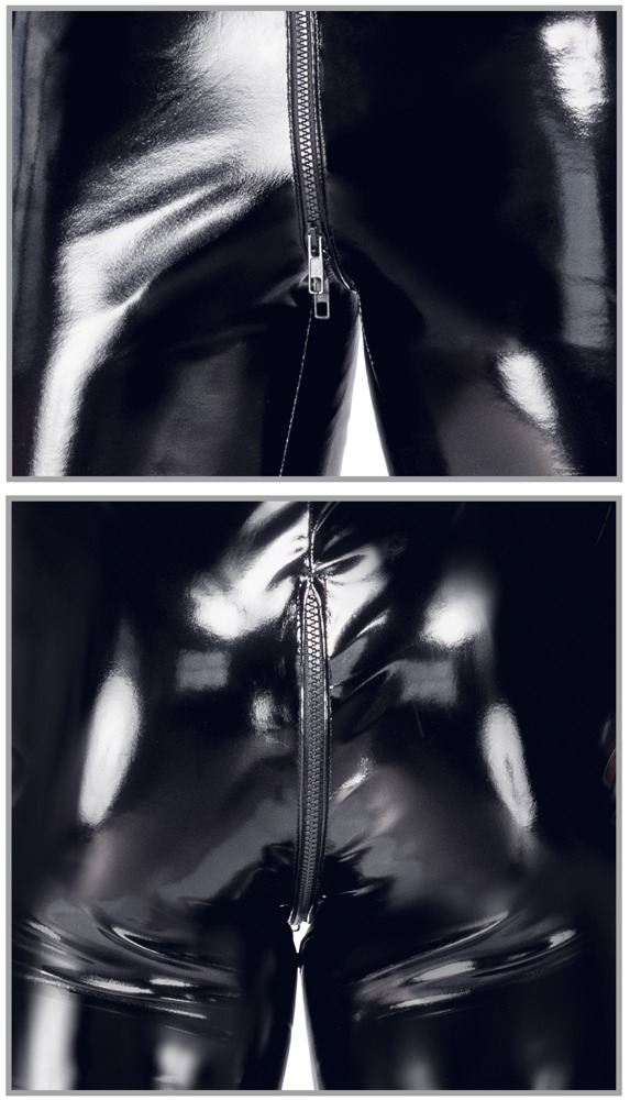 The shiny black vinyl playsuit from Black Level has short sleeves and legs. It is slightly stretchy for a tight-fitting but comfortable fit. It also has a padded 3-way zip that starts at the striking stand-up collar, goes over the crotch and then stops at the top of the buttocks.