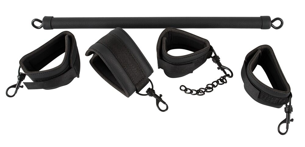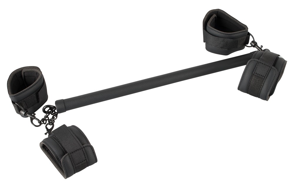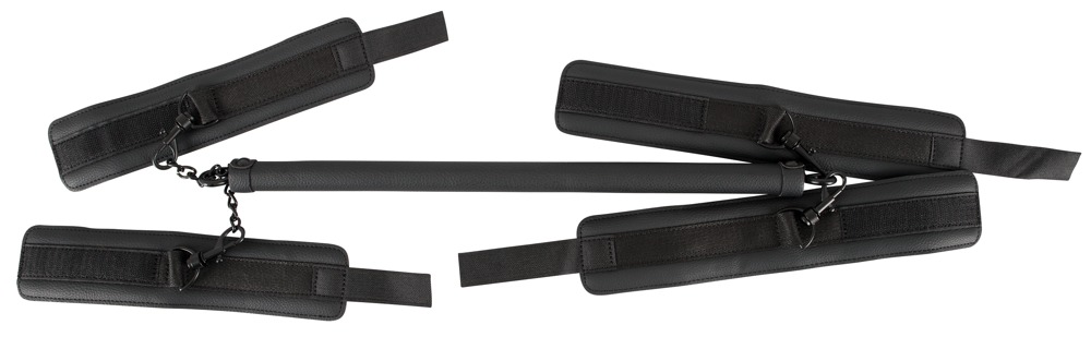 Sturdy spreader bar with handcuffs and ankle cuffs that can be attached at either end. The included imitation leather restraints are softly padded and can be adjusted with the hook and loop fasteners. The restraints can be attached to the spreader bar with the snap hooks. The short metal connection chain can be used to join the restraints together so that they can also be used on their own.
